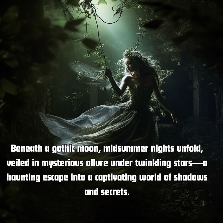 Beneath a gothic moon, midsummer nights unfold, veiled in mysterious allure under twinkling stars—a haunting escape into a captivating world of shadows and secrets.